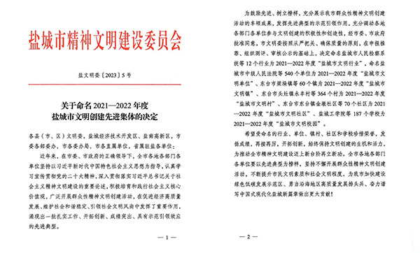 喜報(bào)!海興集團(tuán)榮獲“鹽城市文明單位”稱號